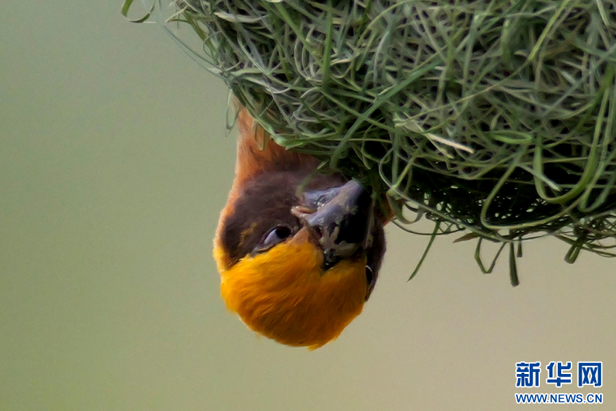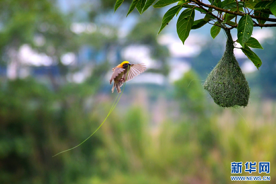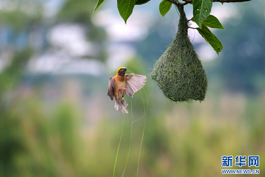 黄胸织布鸟正在筑巢(6月6日摄)。新华网发(昌宁县融媒体中心供图)