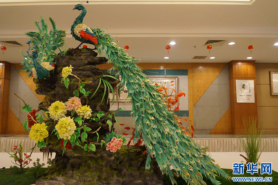用面条雕刻的孔雀(摄于6月15日)。
