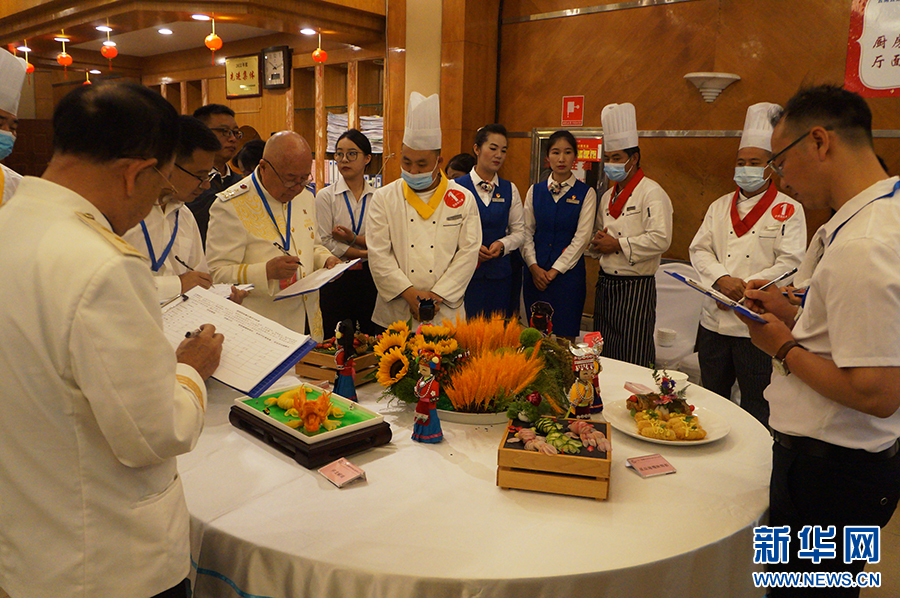 竞赛现场,评委在对菜品打分(摄于6月15日)。