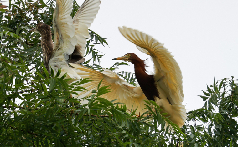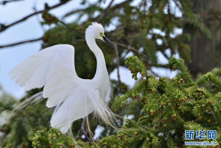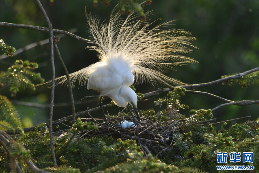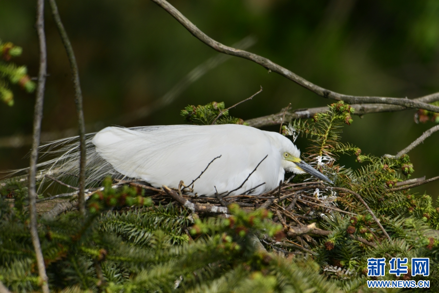 白鹭衔树枝筑巢(6月11日摄)。新华网发(昌宁县融媒体中心供图)