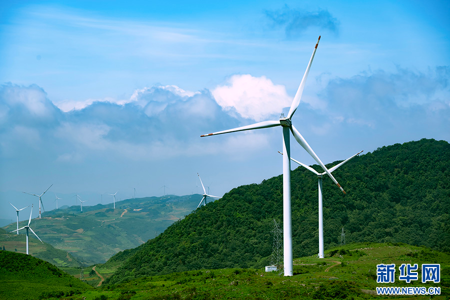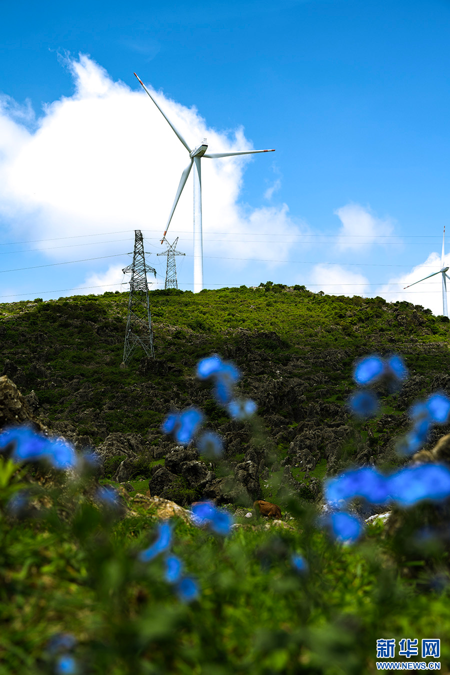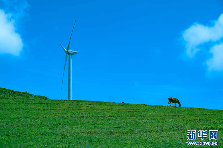 丘北县舍得草场内,旋转的风车与连绵不绝的高原草场构成了美丽的舍得风光(6月21日摄)。新华网发(刘起 摄)