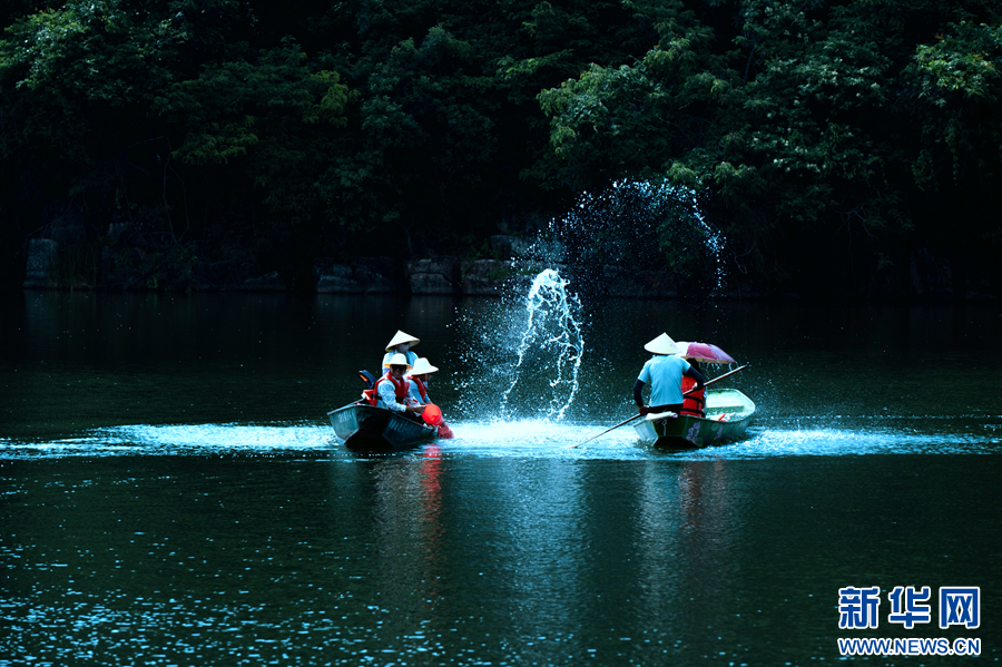 游客在普者黑景区乘船游玩,互相泼水嬉戏(6月21日摄)。新华网发(刘起 摄)