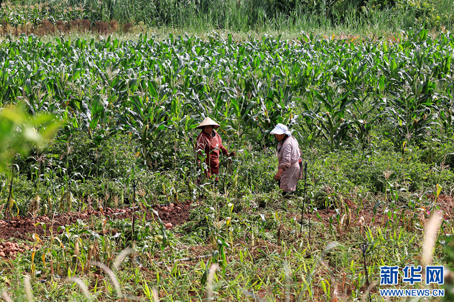 在云南省曲靖市沾益区金龙街道云龙社区,农民正在管护玉米(6月21日摄)。新华网发(孙文来 摄)