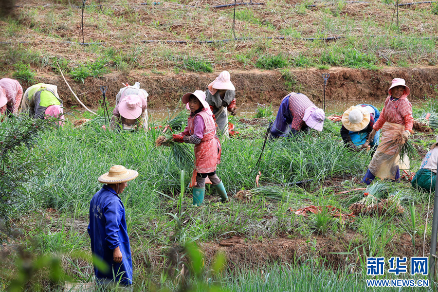 在云南省曲靖市沾益区金龙街道云龙社区,农民正在采收蒜苗(6月21日摄)。新华网发(孙文来 摄)