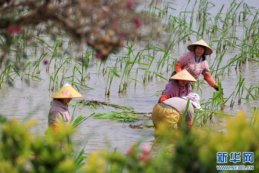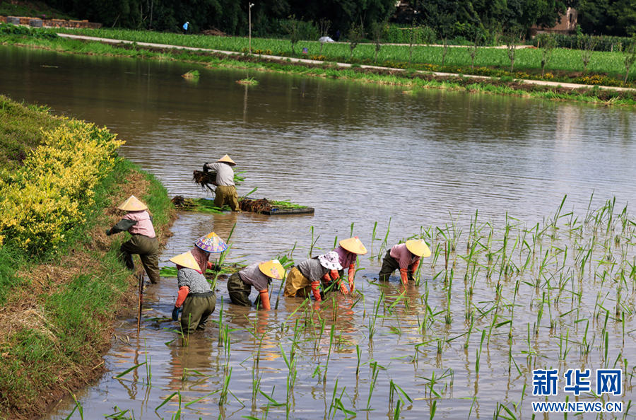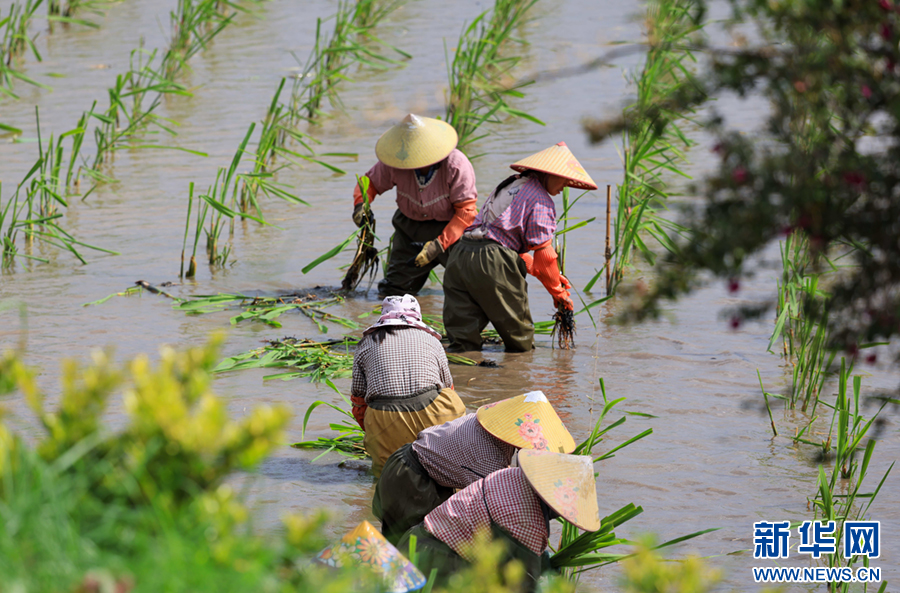 在云南省曲靖市沾益区金龙街道云龙社区,农民正在栽种茭白苗(6月21日摄)。新华网发(孙文来 摄)