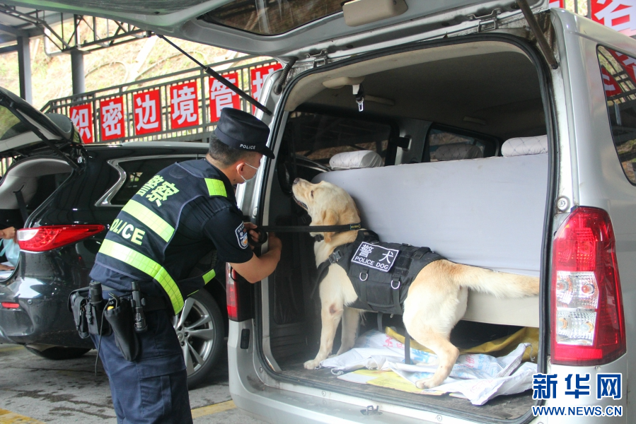 图为警犬“云骁”在车内搜索(资料图)。新华网发(保山边境管理支队供图)