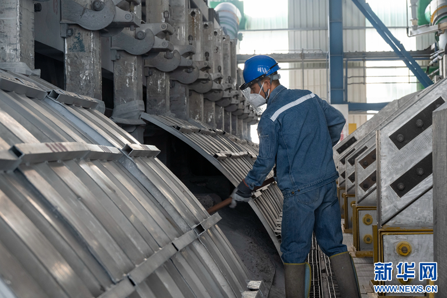 云南宏泰新型材料有限公司电解铝车间里,工人正在进行电解槽维护(6月20日摄)。新华网发(刘起 摄)
