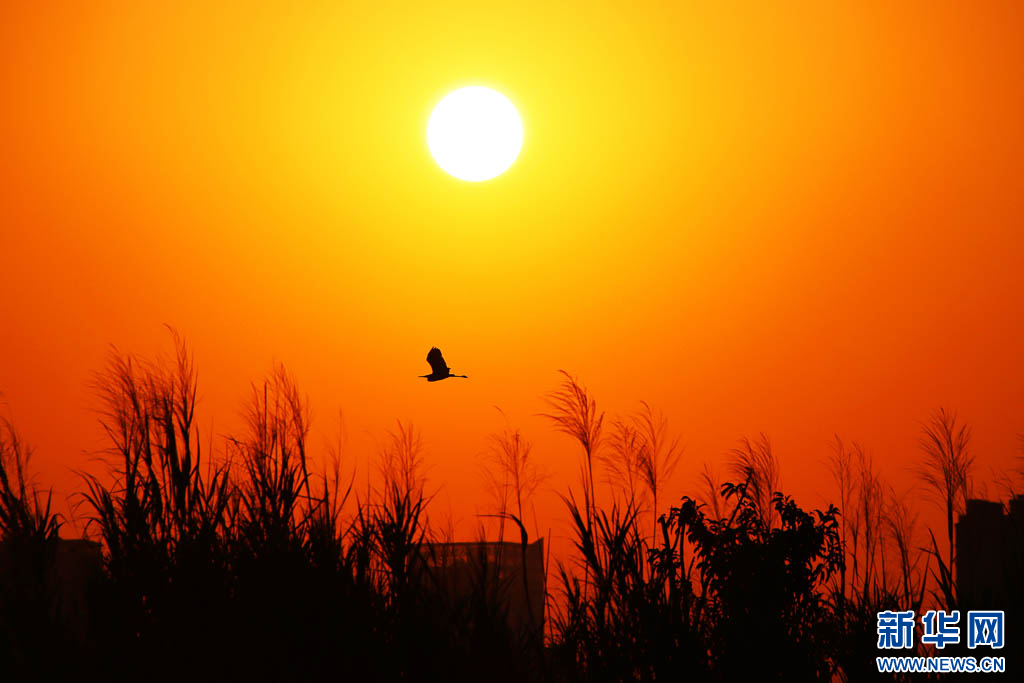 朝阳下,苍鹭振翅高飞(6月11日摄)。新华网发(赵树龙 摄)