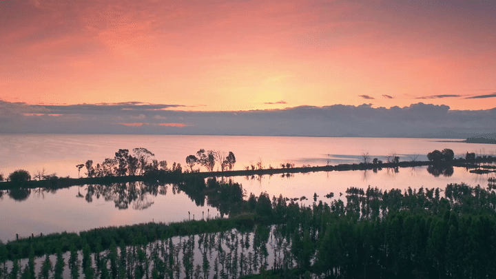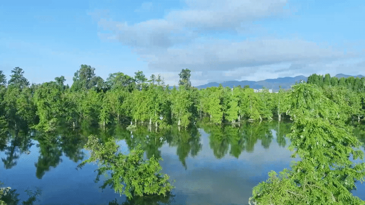 盛夏时节,云南晋宁南滇池国家湿地公园迎来繁茂季节。清晨,绯红朝霞洒落湿地,翠绿杉林郁郁葱葱,蓝天流云,倒映水中,构成一幅生机勃勃的生态画卷。