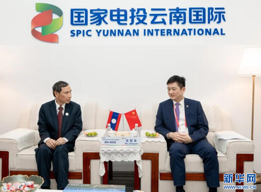 7月23日,老挝人民民主共和国能源与矿产部副部长通帕·英塔翁与云南国际党委书记、董事长吴智泉座谈。(国家电投云南国际供图)