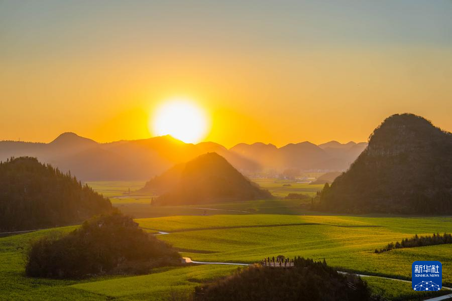 云南省云南省曲靖市罗平县金鸡峰丛油菜花海日出美景(2月19日摄,无人机照片)。新华社记者 胡超 摄