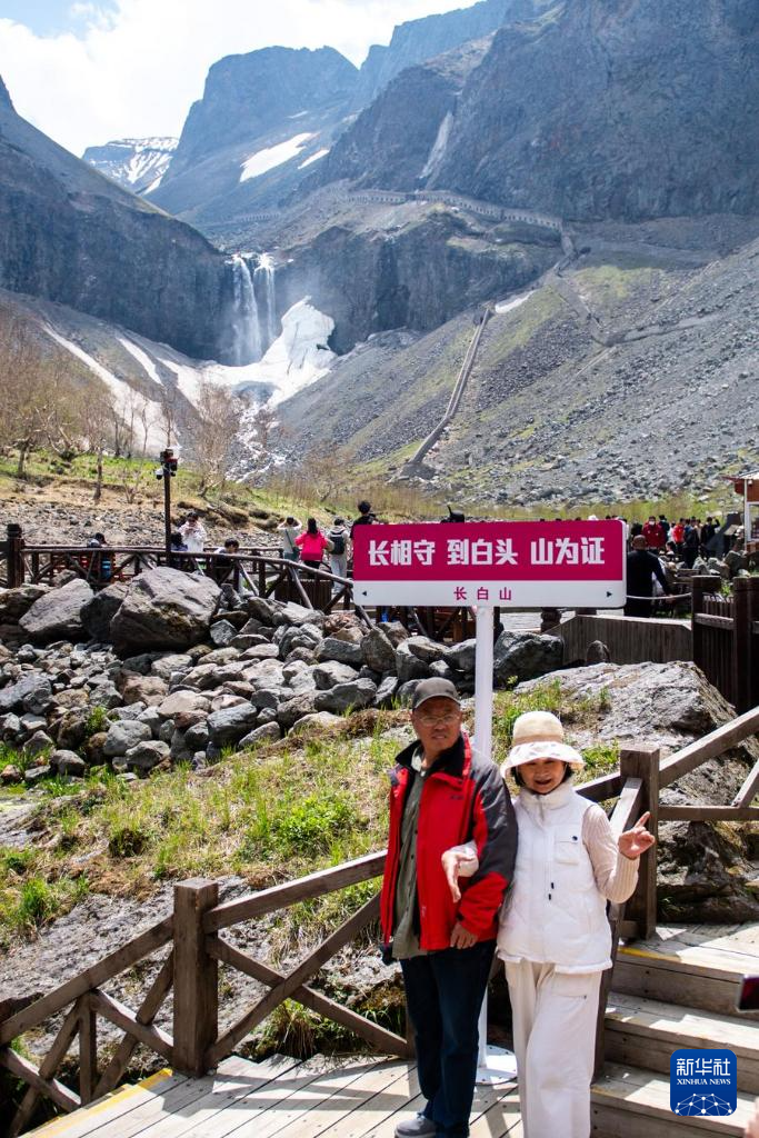 2024年6月5日,游客在长白山北景区瀑布前合影留念。新华社记者 许畅 摄