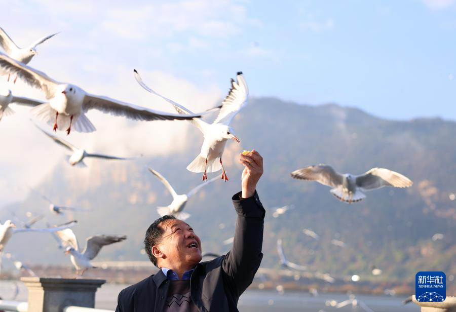 游客在云南省昆明滇池海埂大坝投喂红嘴鸥。新华社发(刘元嵩摄)