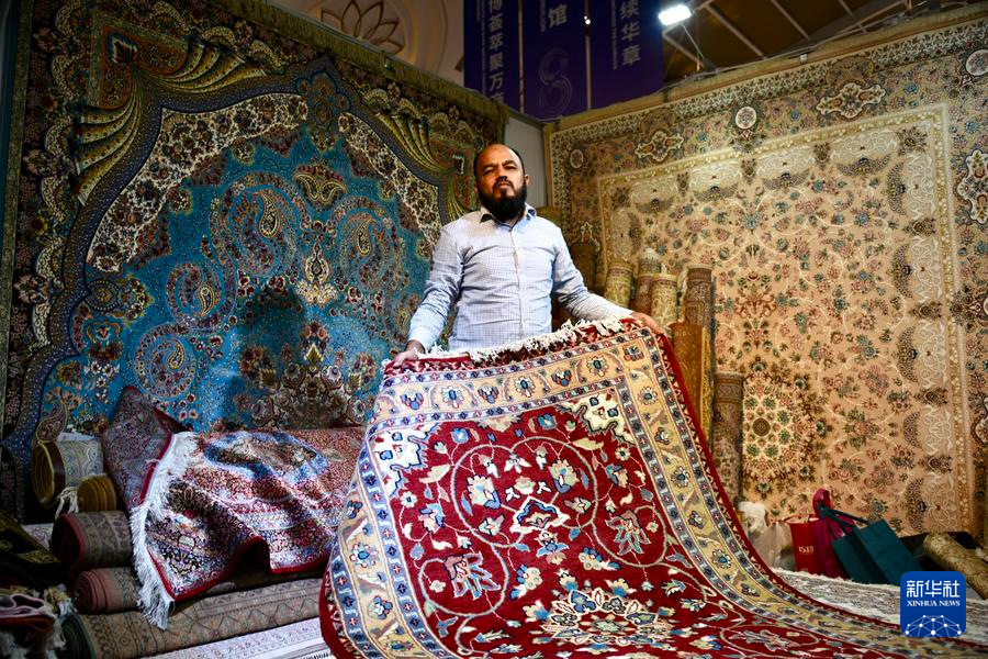 7月24日,一名巴基斯坦参展商展示手工地毯。新华社记者 王贤思 摄