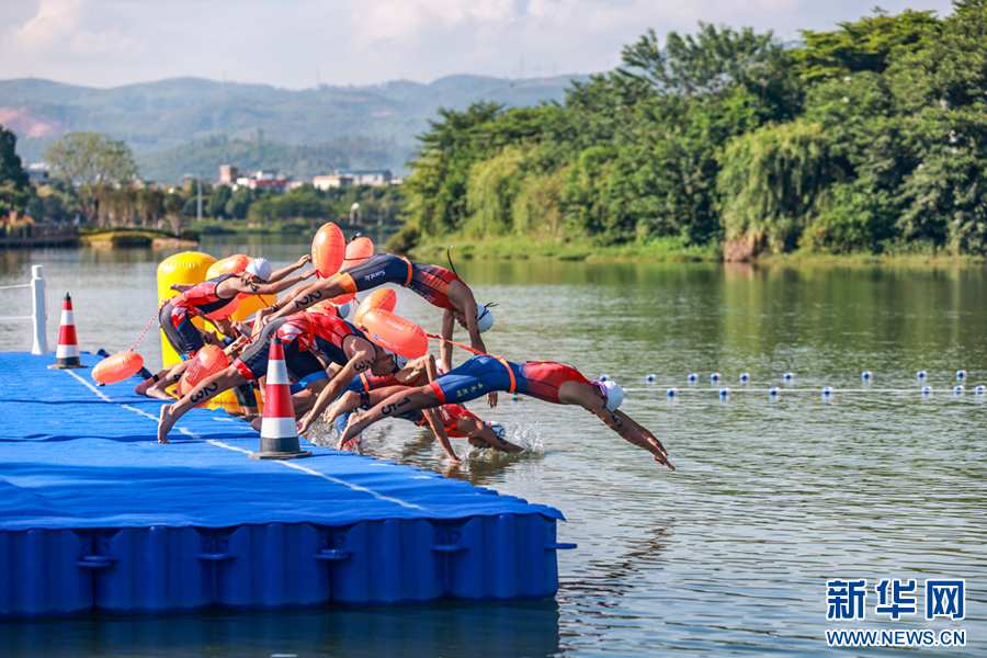 7月24日,云南省第二届青少年(学生)运动会铁人三项比赛中,选手跃入水中。新华网发(陶家淇 摄)