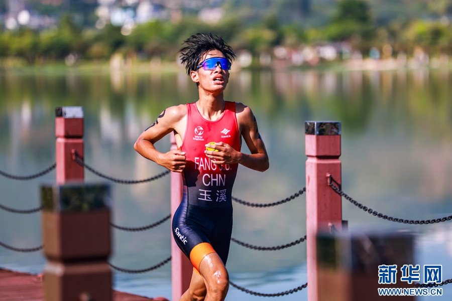 7月24日,云南省第二届青少年(学生)运动会铁人三项比赛中,参赛选手结束游泳起水瞬间。新华网发(陶家淇 摄)