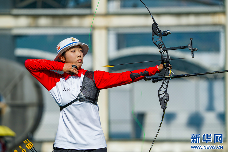 7月26日上午,云南省第二届青少年(学生)运动会射箭项目女子团体决赛,队员出箭瞬间。新华网发(陶家淇 摄)
