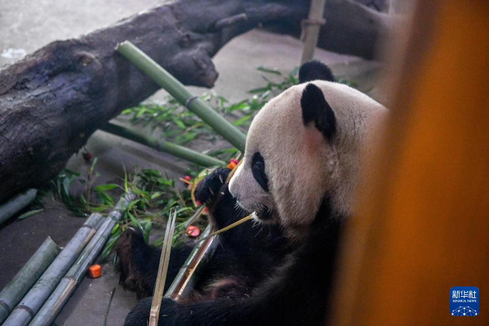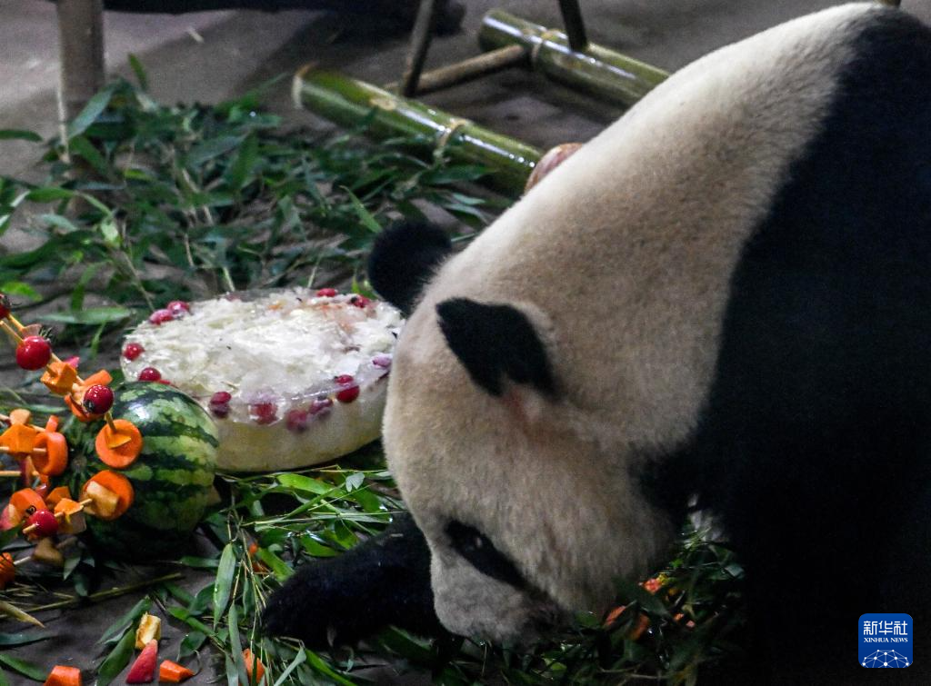 8月2日,大熊猫“珍多”在活动内场吃“生日蛋糕”。新华社发(朱敬熹 摄)