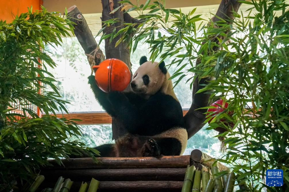8月2日,大熊猫“珍多”在活动内场玩耍。新华社发(莫欣竹 摄)