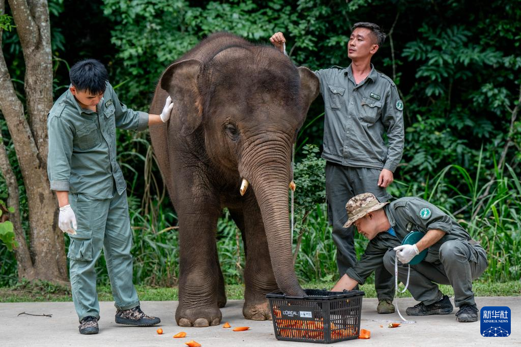 8月8日,“象爸爸”在给龙龙体检。新华社记者胡超 摄