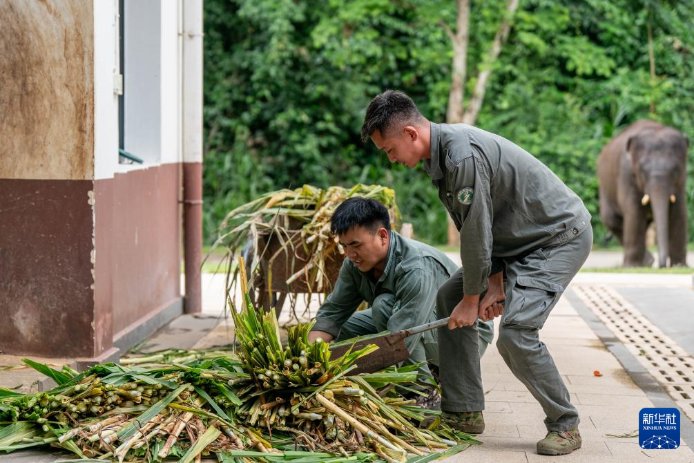 8月8日,“象爸爸”在给龙龙切晚餐食用的象草,龙龙在远处观看。新华社记者胡超 摄
