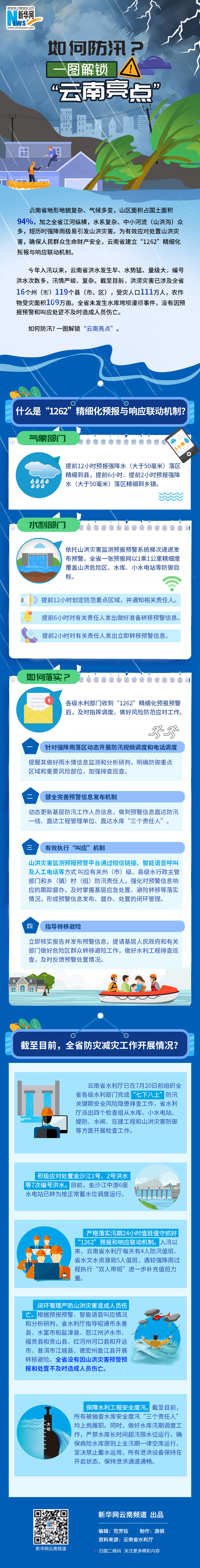 云南省地形地貌复杂、气候多变,山区面积占国土面积94%,加之全省江河纵横,水系复杂、中小河流(山洪沟)众多,短历时强降雨极易引发山洪灾害。为有效应对处置山洪灾害,确保人民群众生命财产安全,云南省建立“1262”精细化预报与响应联动机制。