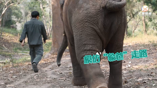 对于暂时无法融入象群的小象来说,“象爸爸”也是它们的模仿对象。小象在跟“象爸爸”去野外做康复训练时,“象爸爸”走在前面,小象跟在后面,就会模仿“象爸爸”走路的动作。
