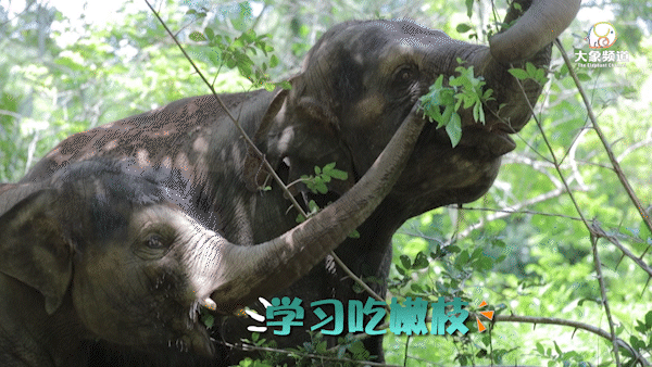 但是很重要的生存技能——采食,它们就需要模仿才能学会。不仅是学采食的动作,更要学习辨别食物的能力。这一点,在救助象“然然”的女儿“景景”身上很容易观察到。在野外活动的过程中,“景景”的模仿速度非常快,它看到妈妈和阿姨吃什么,就会跟着吃什么,在采食的过程中,它看到妈妈或阿姨采食嫩枝嫩叶,就会跟着去一同采食,如果树比较高它够不到,它也会学着成年象的方式用脚去踩踏小树,或用身体压住小树,让小树低一些,让自己能够吃到更美味的食物。正因如此,“景景”在野外的采食能力也远胜于中心其他没有妈妈或大象带的小象。
