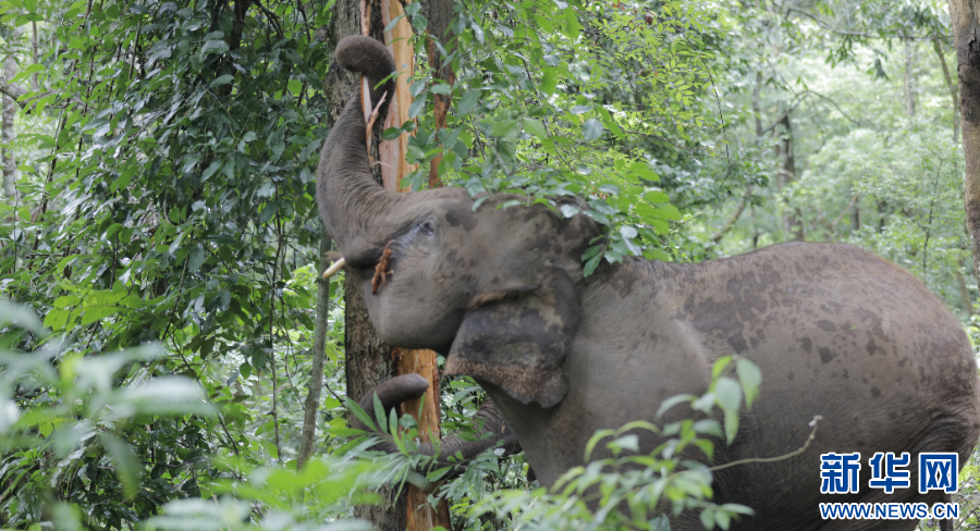 亚洲象在野化中撕扯树皮(2023年7月15日摄)。新华网发 徐华陵 摄