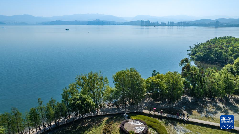 大理市洱海边生态廊道一景(无人机照片,4月14日摄)。新华社记者 胡超 摄