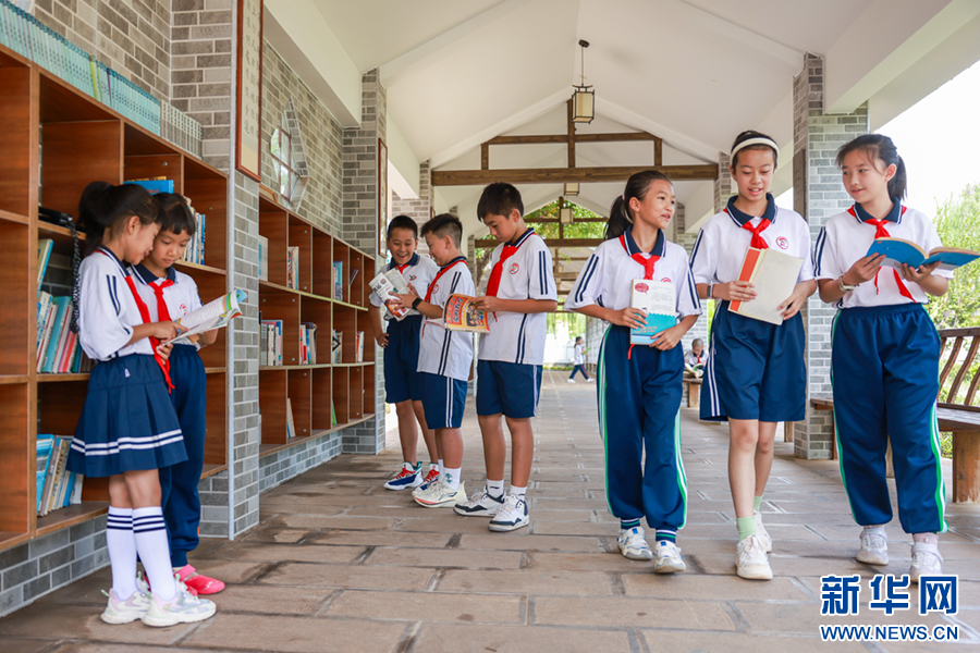 9月2日,云南省开远市东城小学大课间休息时,学生在阅读长廊看书。新华网发(陶家淇 摄)