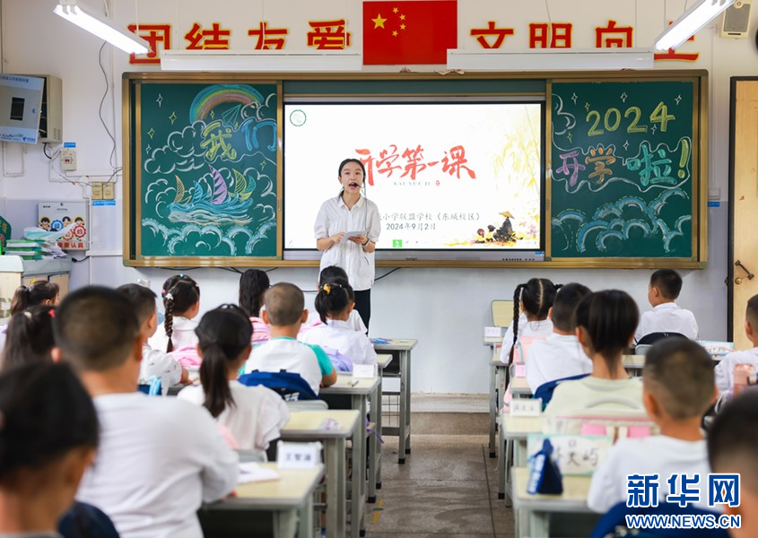 9月2日,云南省开远市东城小学,老师在给一年级学生上开学第一课。新华网发(陶家淇 摄)