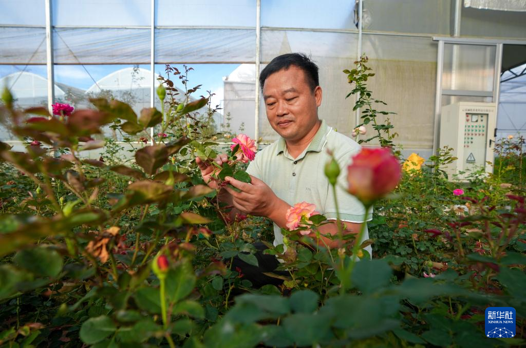 8月23日,李淑斌在位于晋宁区的育种基地大棚内查看月季新品种长势。新华社记者 陈欣波 摄