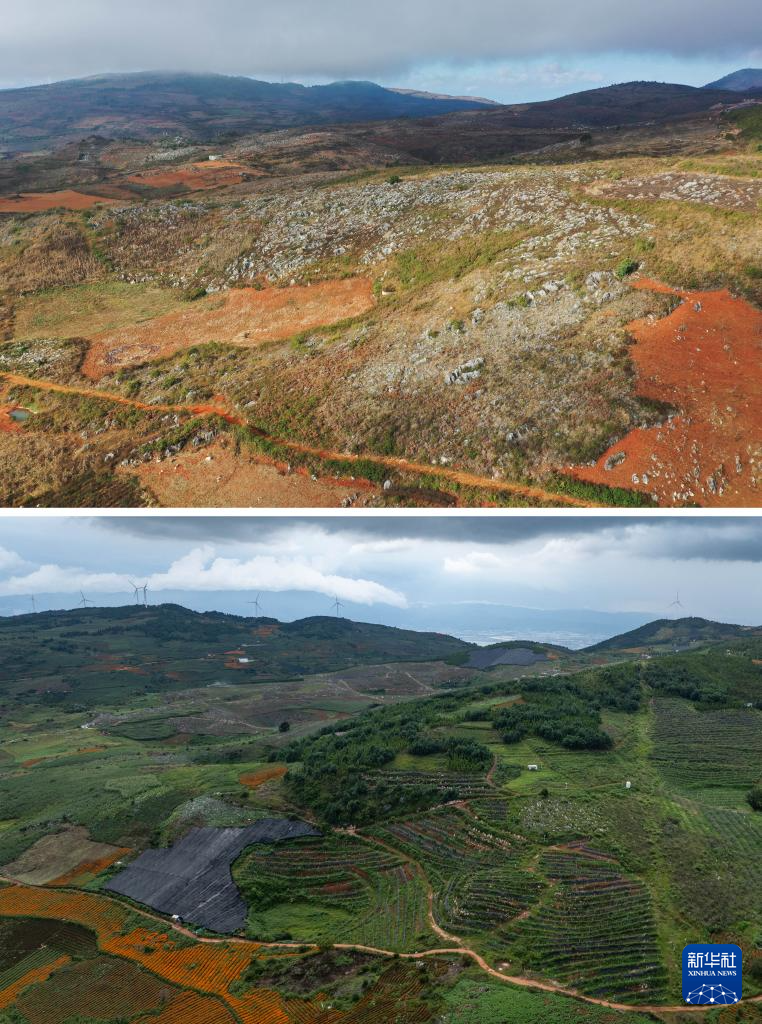拼版照片,上图为:2019年1月拍摄的云南省红河州蒙自市西北勒乡一景(无人机照片,新华社发);下图为:2024年9月3日拍摄的云南省红河州蒙自市西北勒乡生态修复后的景象(无人机照片,新华社记者胡超摄)。新华社发