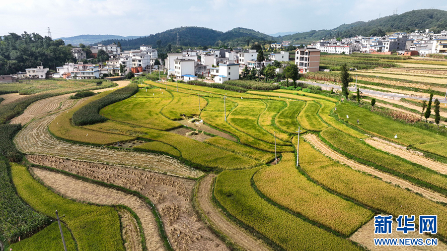 9月4日,云南省曲靖市沾益区天生坝村,梯田与村舍勾勒出一幅优美的田园丰收画卷。新华网发(孙文来 摄)