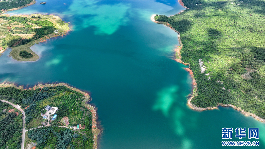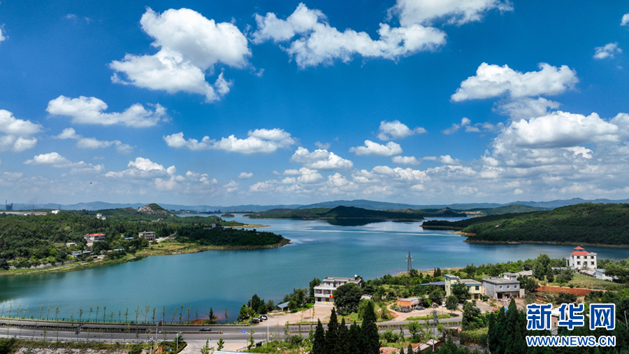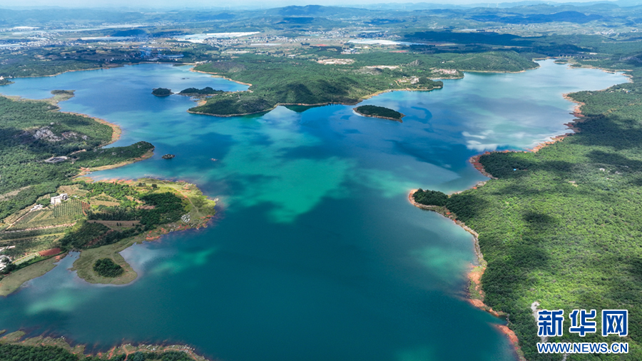 航拍云南曲靖花山水库,蓝天碧水宛如画卷(9月5日摄)。新华网发(孙文来 摄)