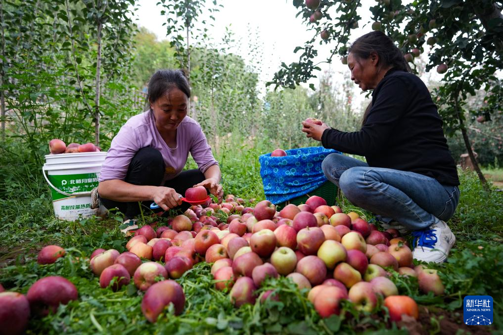 9月29日,在昭通市昭阳区洒渔镇,两名当地果农在果园内对刚采摘的苹果进行初步分级。新华社记者 陈欣波 摄