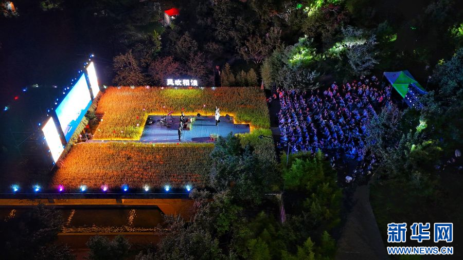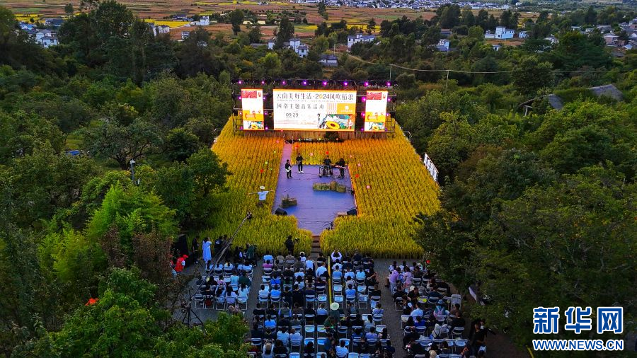 新华网昆明9月30日电(范芳钰)丰收时节,云南省大理白族自治州洱源县凤羽镇万亩稻田陆续迎来丰收。伴随着阵阵稻香,9月29日晚,一场美妙的音乐会在凤羽镇佛堂村空中稻田剧场上奏响,“云南美好生活·2024风吹稻浪”网络主题音乐活动就此拉开帷幕。