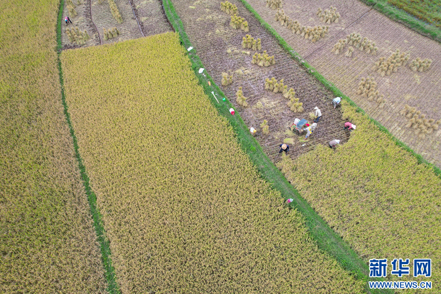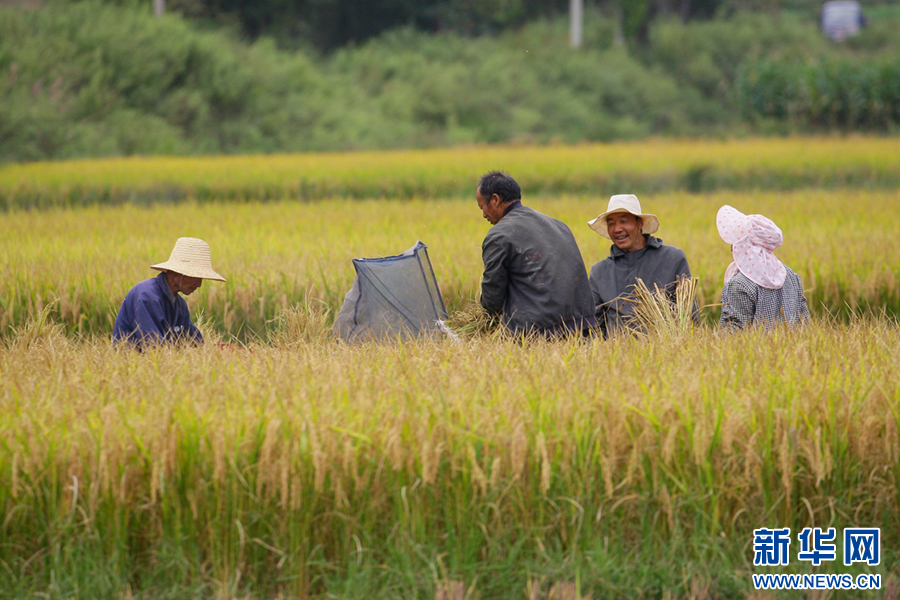 9月28日,云南省曲靖市沾益区威格村,农民正在收割水稻。新华网发(杨俊鹏 摄)