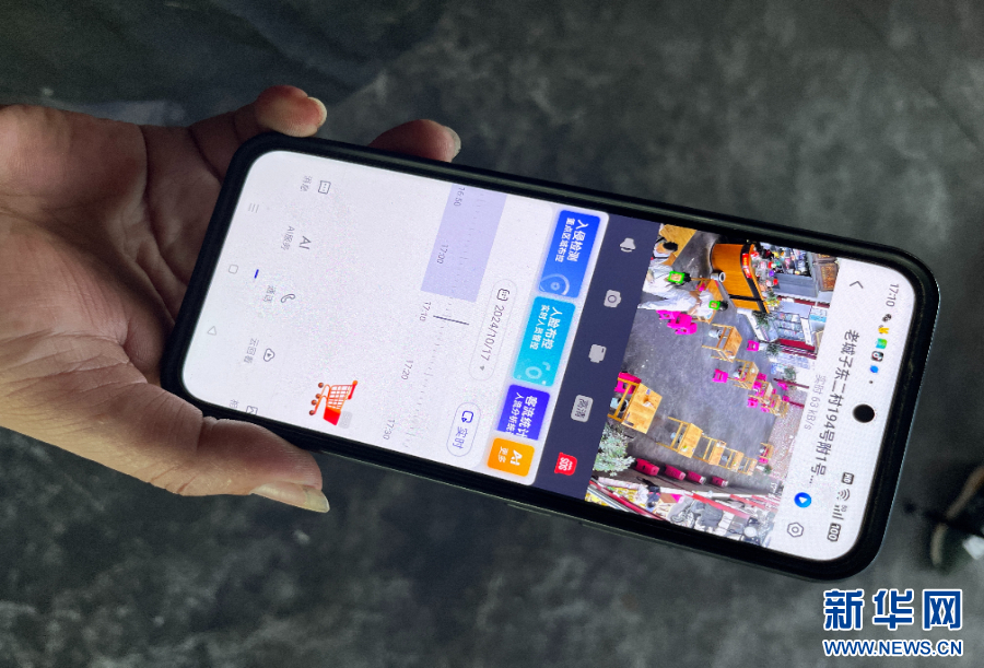 老依烧烤店的老板尹照富在手机上查看店内情况(摄于10月17日)。新华网 刘馨蔚 摄