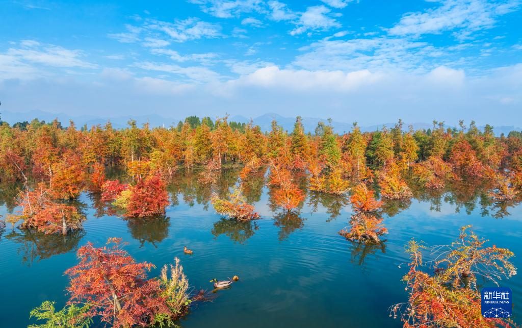 深秋时节,位于云南晋宁的南滇池国家湿地公园,在秋日的朝阳下,连片的水杉林与静谧的湖水相映成趣,似一幅绚丽的水彩画,将秋天的韵律美好呈现。