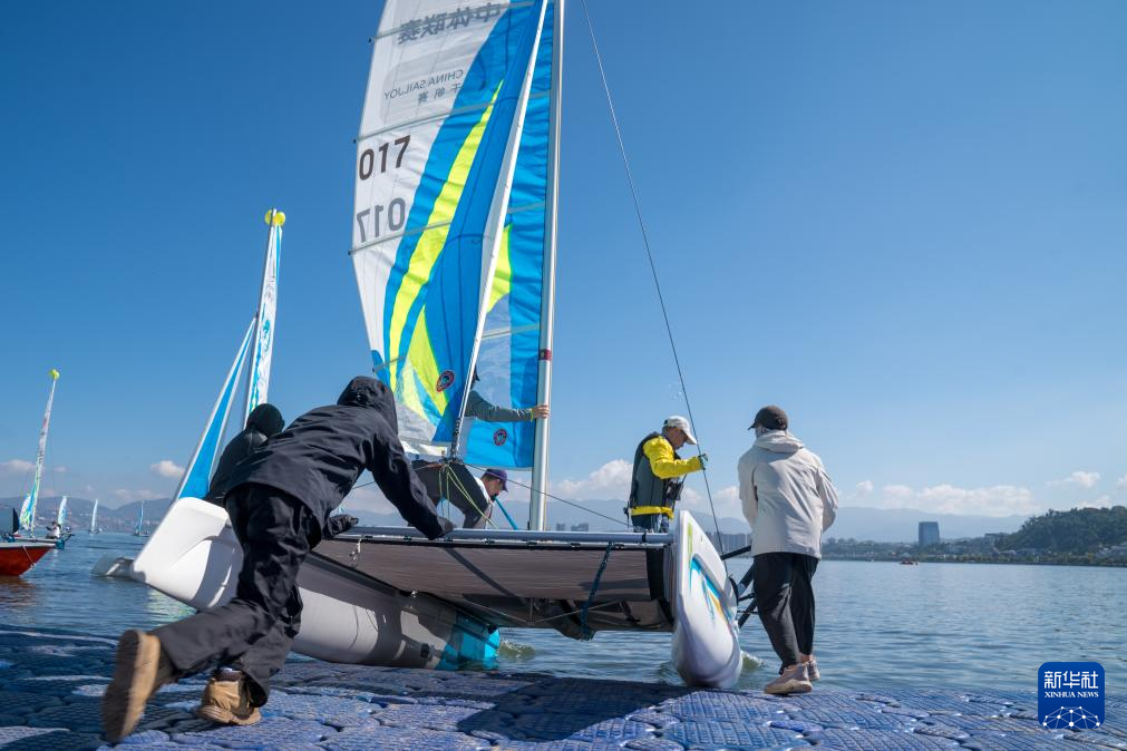 10月26日,参加中国万水千帆赛(大理站)比赛的船只从出发点下水。新华社记者 彭奕凯 摄