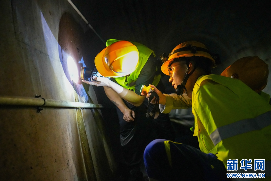 作业人员检查隧道壁上的减压孔疏水情况(摄于10月29日)。新华网发(殷学合 摄)