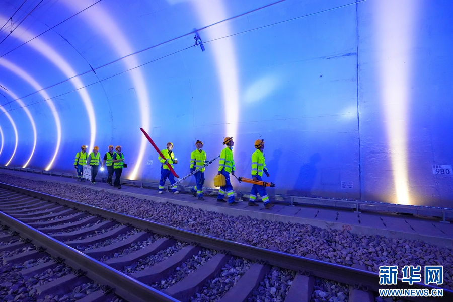 作业人员在中老铁路友谊隧道里巡视排查安全隐患(摄于10月29日)。新华网发(殷学合 摄)