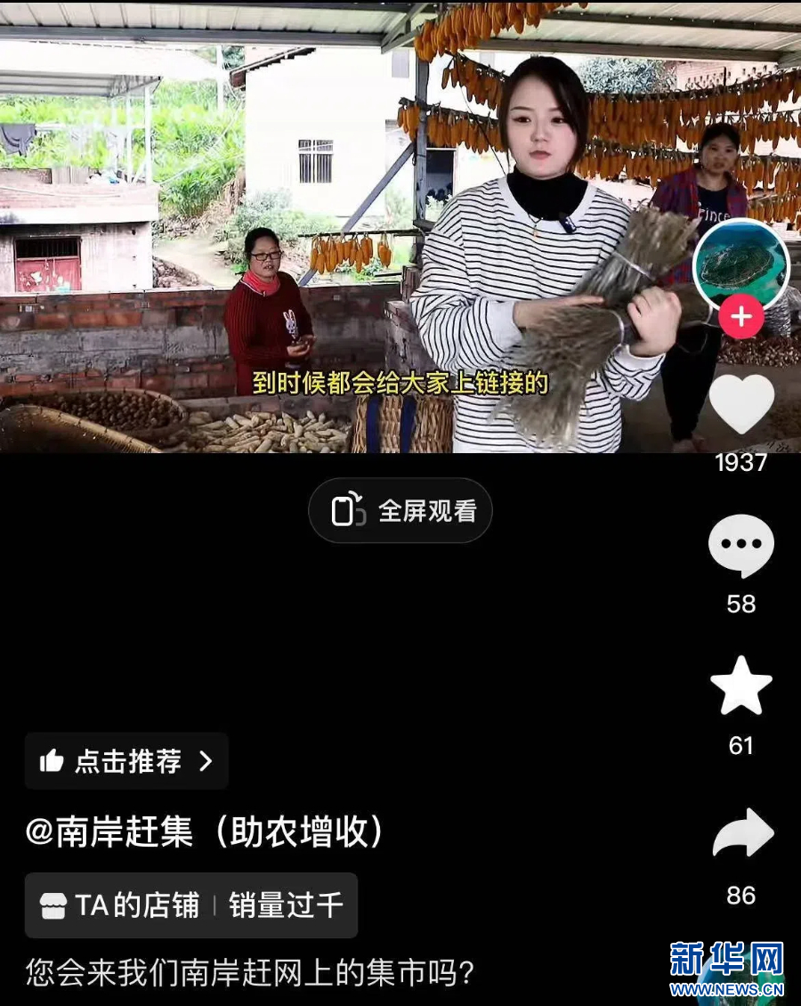 “人气最高的时候直播间有上千人,全国各地的客户都有。”南岸镇党委书记赵晏说,“南岸赶集”是南岸镇在抖音平台上开通的助农账号,旨在帮助村中老人打开土特产销售渠道,产品不固定,“主要取决于村民家里有啥。”目前,“南岸赶集”账号的店铺主页显示,售价60元的“农家土副产品”已售103件,好评率100%。