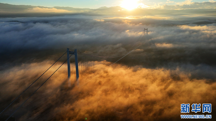 初冬的清晨,摄影师用无人机拍摄到了云南龙江大桥“腾云驾雾”的壮美景象。龙江大桥位于云南省西部、横断山脉南段,是保腾(保山—腾冲)高速公路的重点工程,跨越龙江河谷,总长2470余米,桥面距谷底高度280米。初冬云海中的龙江大桥,气势如虹,雄伟壮观。新华网发(赵辉 摄)