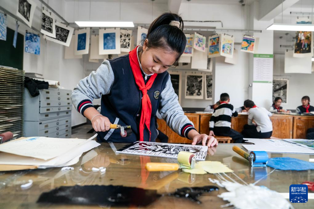 11月12日,曲靖市第二小学的学生在创作当地特色的爨文化版画作品。新华社记者 胡超 摄