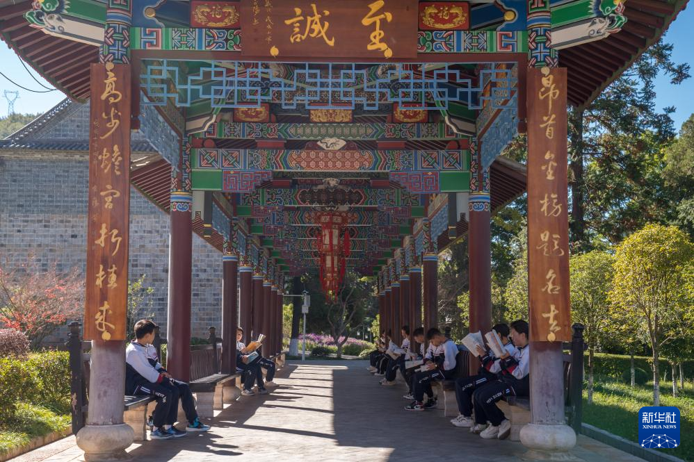 11月12日,在云南省会泽县第一中学,学生们在长廊内聊天、看书。新华社发(彭奕凯 摄)