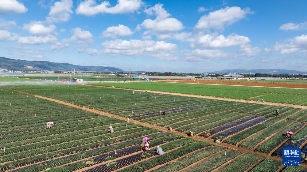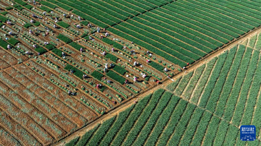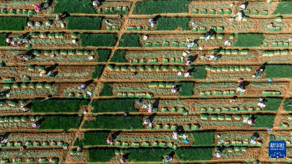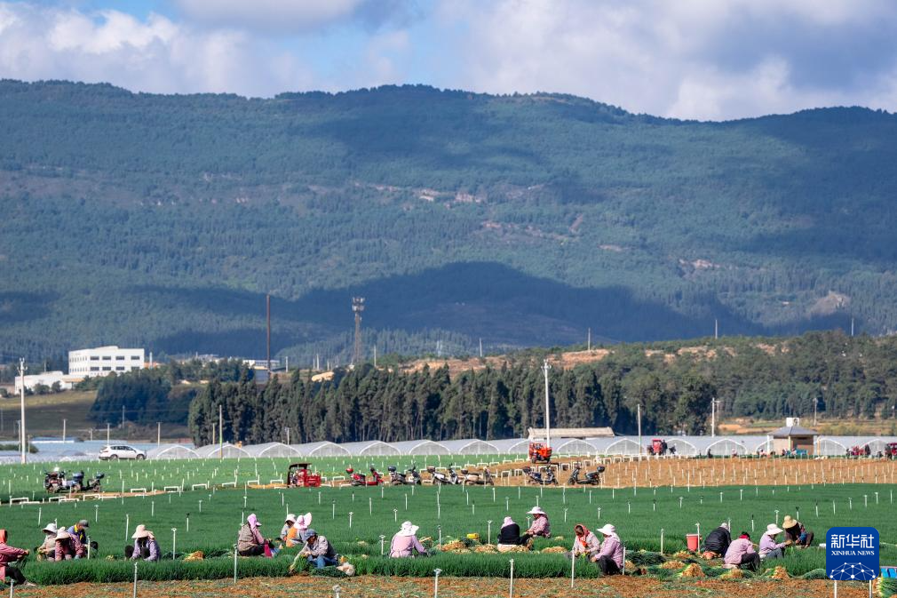 11月13日,菜农在曲靖市麒麟区越州镇现代农业产业园采收小葱。新华社记者 胡超 摄
