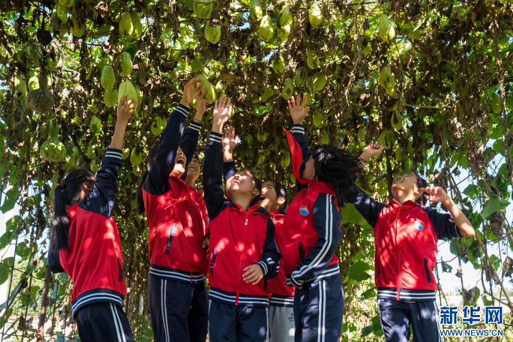 11月15日,靖外明德小学的劳动课上,学生在采摘丰收瓜。新华社发(彭奕凯 摄)